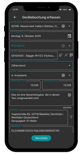 Ja. Zeiten, Leistungen und Geräteeinsätze werden systemgestützt weiterverarbeitet. Dadurch entsteht eine durchgängige Datenbasis von der Baustelle bis zur kaufmännischen Auswertung.