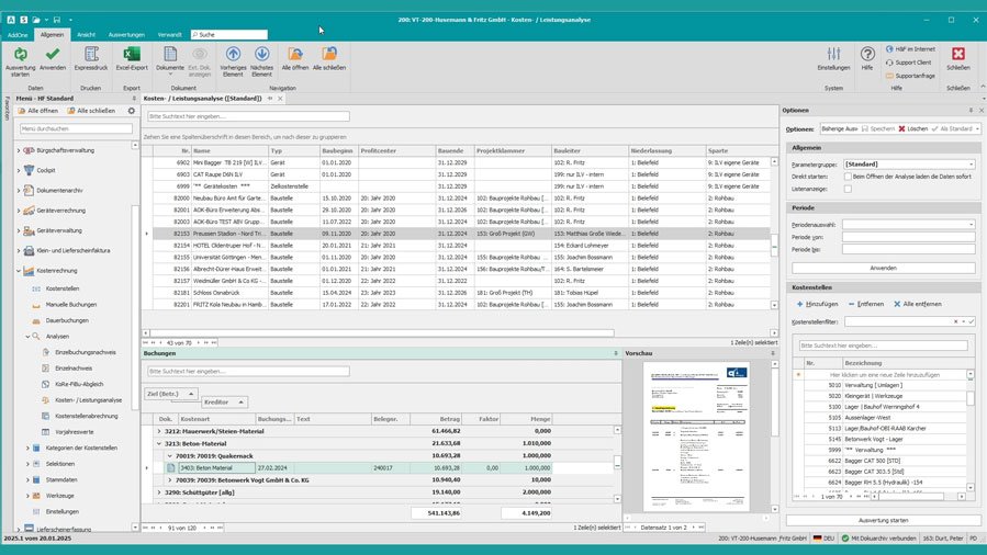 Das Modul erfasst Kostenstellen, Kostenträger und Kostenarten und stellt diese strukturiert dar. Damit erhalten Bauunternehmen eine transparente Grundlage für Projektsteuerung und wirtschaftliche Bewertung ihrer Bauvorhaben.