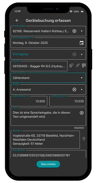 Gerätebewegungen und Einsätze werden mobil gebucht und zentral übernommen. So bleiben Auslastung, Laufzeiten und Projektzuordnungen transparent.