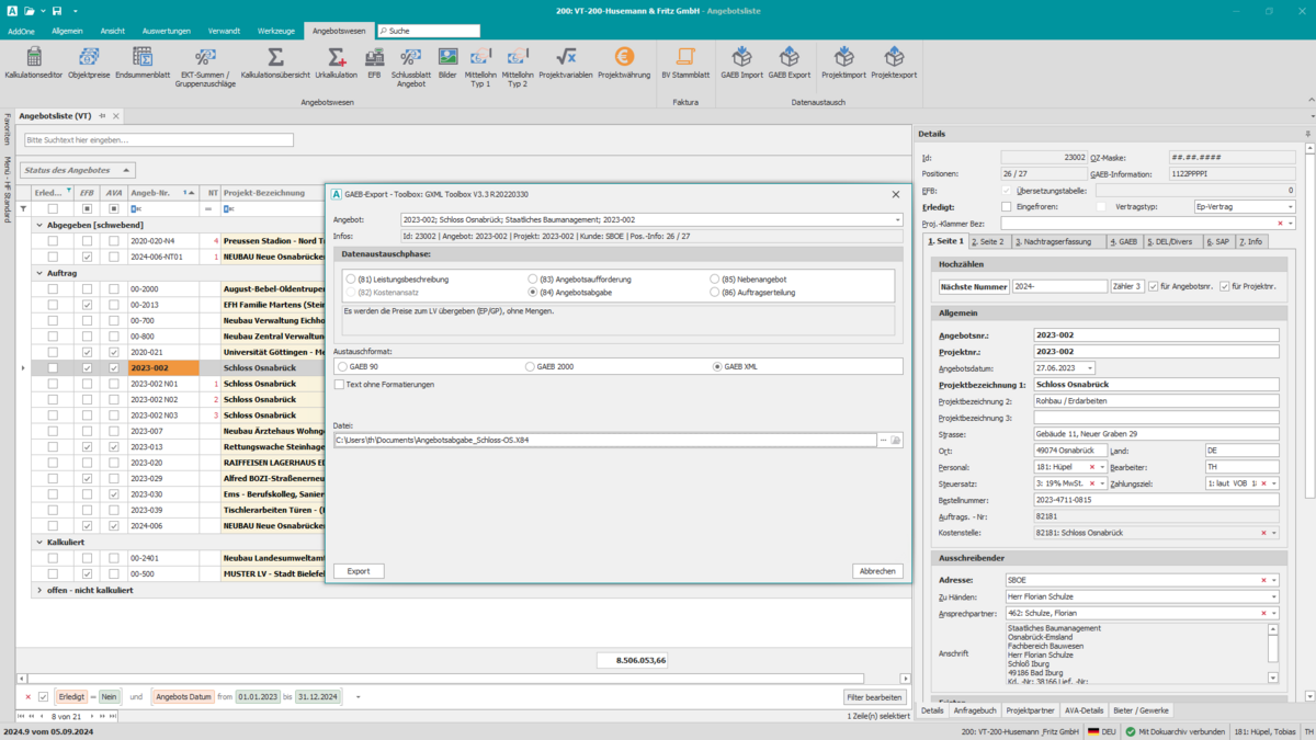 GAEB-Dateien lassen sich direkt aus Ihrer Kalkulation erzeugen – inklusive aller relevanten Austauschphasen und Positionsdaten. Die Ausgabe erfolgt normgerecht, strukturiert und kompatibel mit gängigen Standards für öffentliche Ausschreibungen. So vermeiden Sie Medienbrüche, erhöhen die Nachvollziehbarkeit und übergeben Ihre Angebotsdaten sicher in den digitalen Vergabeprozess.